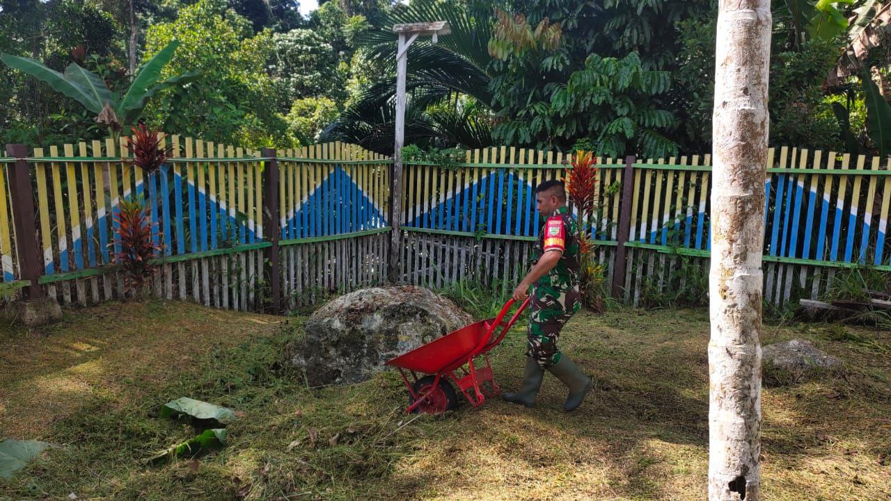 TIFFANEWS.CO.ID,- Menjaga keakraban dan kedekatan antara Babinsa dan warga binaan, Babinsa Koramil 1712-03/Tor Atas , Kampung Samanente Serka Estepanus Wear melaksanakan kegiatan membantu warga membersihkan halaman Gereja Gereja Kristen Injil Di Tanah Papua Klasis Sarmi Timur Jemaat GKI Imanuel Samanente, Distrik Tor Atas, Kabupaten Sarmi, Selasa(18/10/2022)