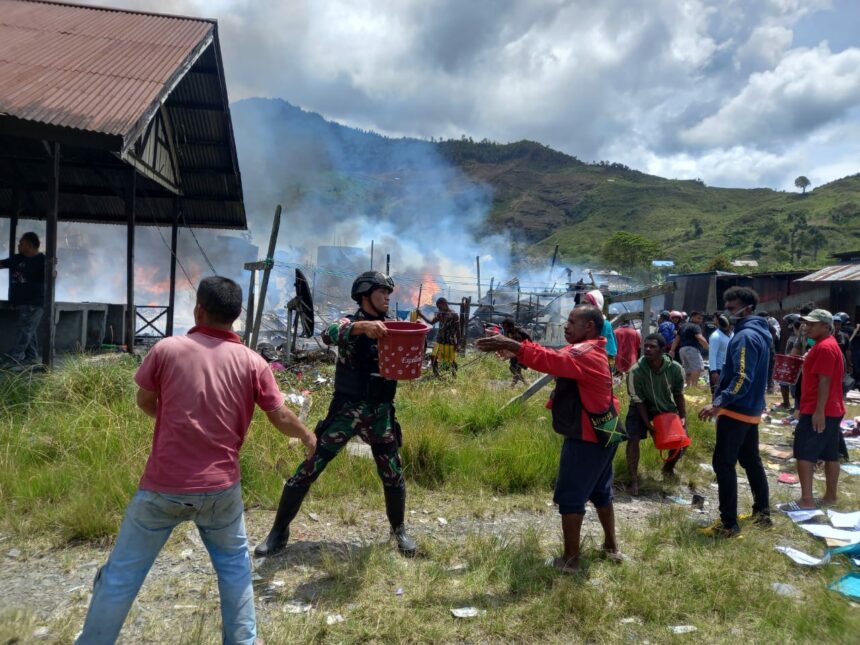 TIFFANEWS.CO.ID, Dengan sigap dan cepat Satgas Yonif Raider Khusus 113/JS membantu memadamkan kebakaran kios milik warga di pasar lama Kota Baru, Kampung Lunggwineri Distrik Pagaleme, Kabupaten Puncak Jaya, Papua Tengah. Selasa (18/10/2022).