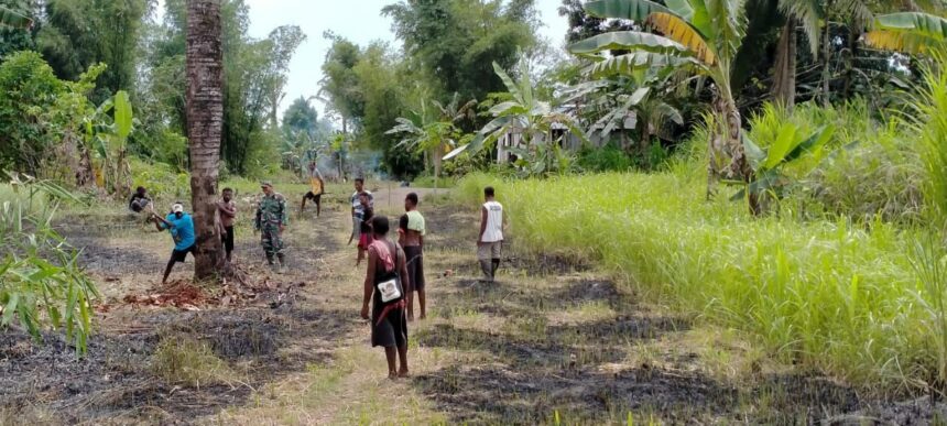 Babinsa Bersama Masyarakat Kampung Wakde Kerja Bakti Bersihkan Jalan