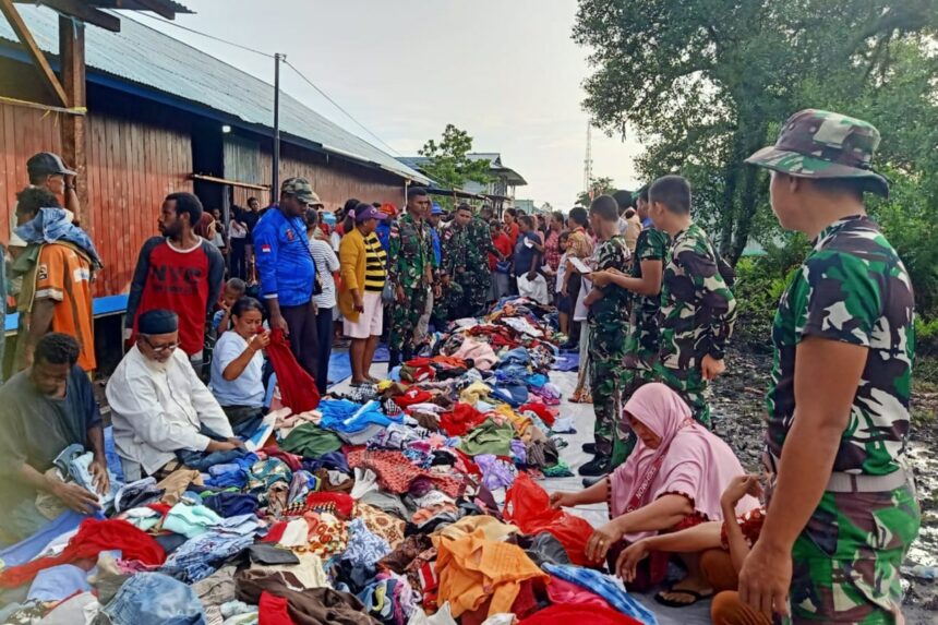 TIFFANEWS.CO.ID,- Komandan Koramil 1707-08/Agats jajaran Kodim 1707/Merauke Kapten Inf Rony K. Retraubun membantu Kepala Dinas Sosial Kabupaten Asmat Amir Mahmud dalam menyalurkan pakaian layak pakai dan sembako kepada para korban kebakaran di Pasar Dolog Jln. Dolog Distrik Agats Kabupaten Asmat. Kamis (10/11).