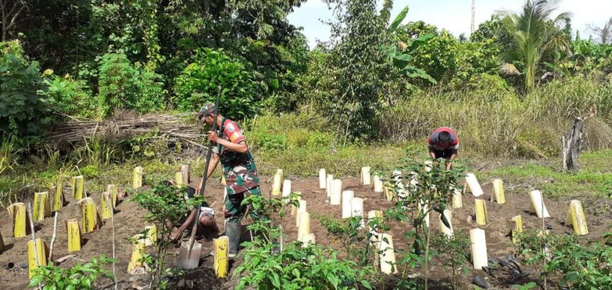 Seperti halnya yang dilakukan oleh Babinsa Koramil 1712-02/Pantai Timur membantu bapak Leo Boven dalam pembuatan lahan untuk menanam rica.