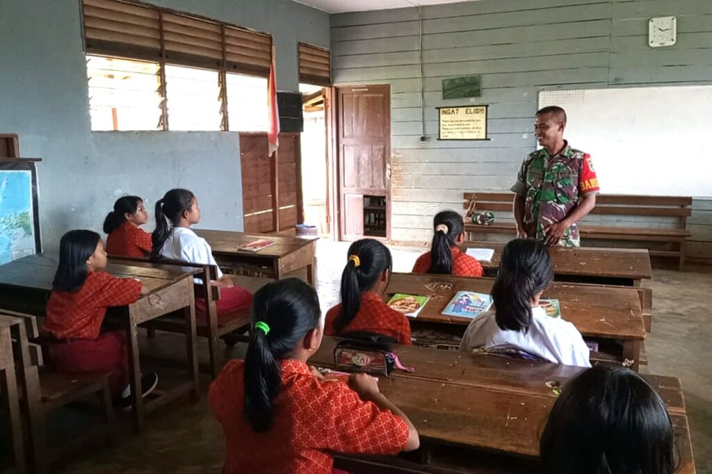 TIFFANEWS.CO.ID,- Dalam rangka membantu meningkatkan kecerdasan para siswa-siswi, Babinsa Koramil 1707-15/Ulilin jajaran Kodim 1707/Merauke Serda Purnomo membantu para guru dalam mengajar kepada siswa-siswi Sekolah Dasar Inpres Rawahayu Kampung Rawahayu Distrik Ulilin Kabupaten Merauke Provinsi Papua Selatan. Kamis (5/1).