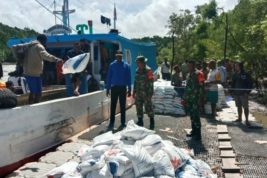 Penyeluran bantuan beras dilaksanakan di di Pelabuhan Waan Distrik Waan Kabupaten Merauke – Papua Selatan Rabu (7/6/2023).,