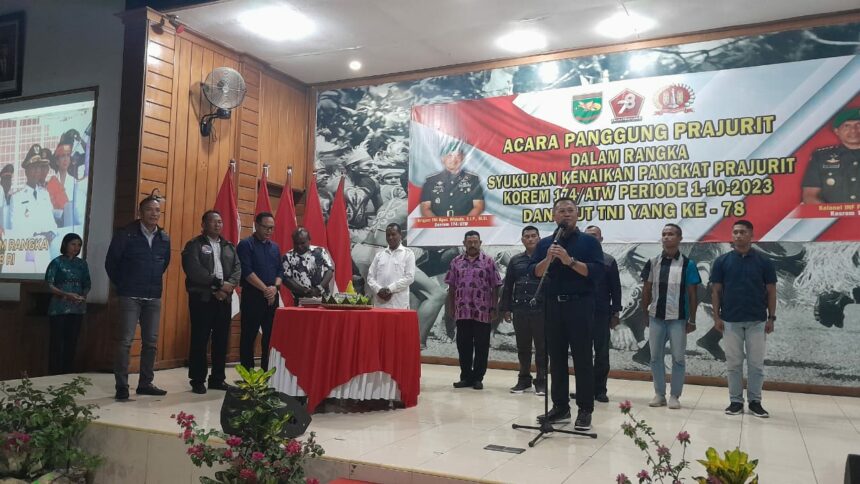 TIFFANEWS.CO.ID,- Komandan Korem 174/ATW Brigjen TNI Agus Widodo, S.I.P., M.Si. gelar acara Panggung Prajurit dalam rangka syukuran kenaikan pangkat Periode 1 Oktober 2023 dan meriahkan HUT TNI Ke-78 tahun 2023, bertempat di Aula LB. Muerdani korem 174/ATW, Kab. Merauke, Prov. Papua Selatan, pada Sabtu (14/10/2023).