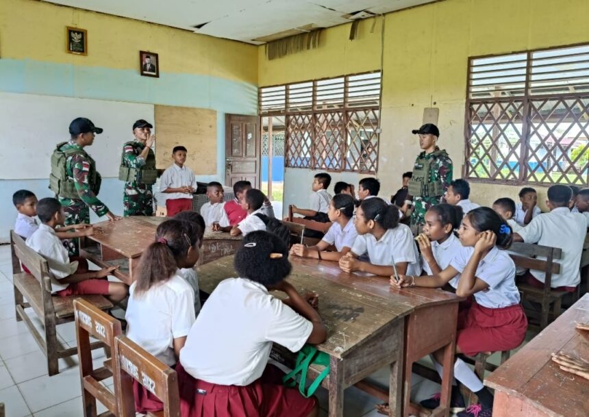 Prajurit Satgas Pamtas RI-PNG Yonif 312/KH Pos Kuler melaksanakan kegiatan sebagai tenaga pendidik (Gadik) di SD YPK Kampung Kuller, Distrik Naukenjerai, Kabupaten Merauke. (Foto: tiffanews.co.id/istimewa)