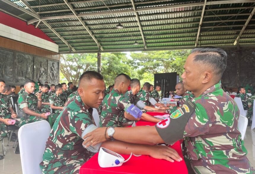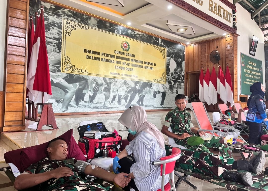 TIFFANEWS.CO.ID – Dalam rangka memperingati Hari Ulang Tahun (HUT) ke-61 Darma Pertiwi tahun 2025, prajurit Yonif TP 802/WMJ turut berpartisipasi dalam kegiatan donor darah yang diselenggarakan oleh Korem 174/ATW. Acara ini berlangsung di Aula L.B. Murdani Korem 174/ATW, yang berlokasi di Jl. Poros L.B. Murdani, Desa Yasa Mulia, Kecamatan Tanah Miring, Kabupaten Merauke, Papua Selatan, pada Selasa (12/2/2025).