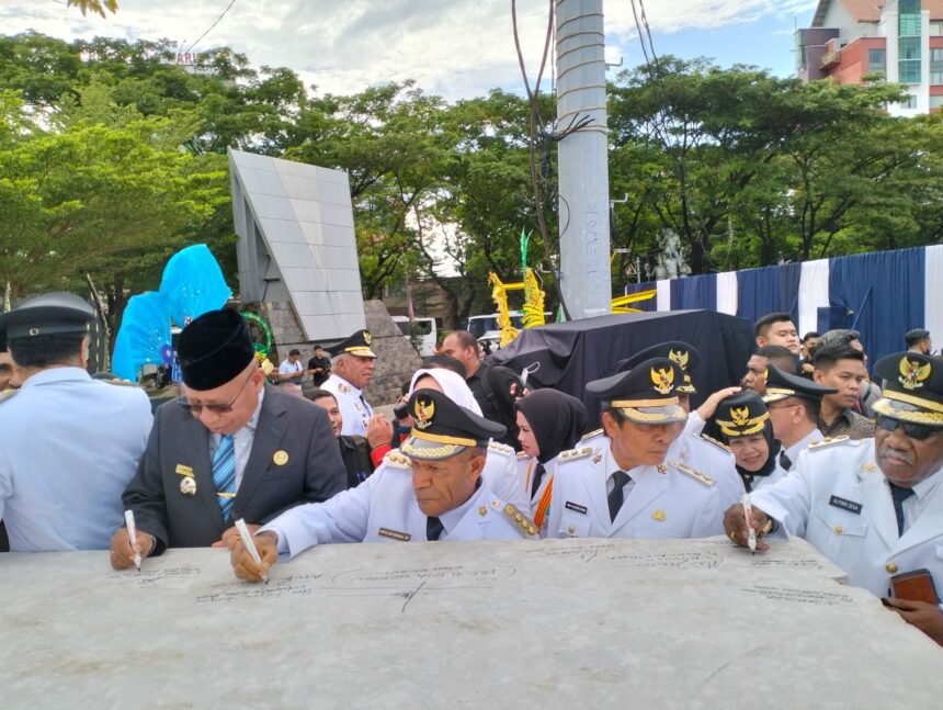 Pj. Bupati Intan Jaya ikut mendandatangani Prasasti Peringatan Hari Otonomi Daerah (Otda) Ke- 27 di Pantai Losari, Makassar, Sulawesi Selatan, Sabtu (29/4).