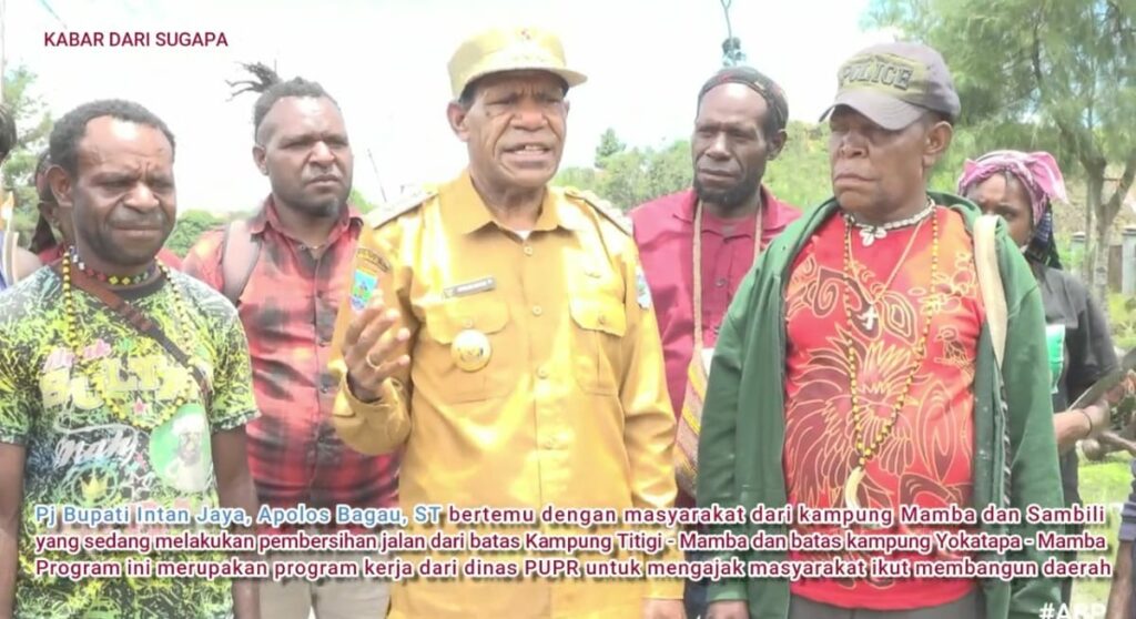 “Masyarakat dari dua desa sedang bersama kepala desa mereka mendapat tugas dari dinas PUPR untuk melibatkan masyarakat melakukan pembersihan jalan. Dua kepala desa ini sedang melakukan pengawasan terhadap masyarakat yang sedang membersihkan jalan,” jelas Pj Bupati saat bertemu dengan masyarakat di depan kantor Kesbangpol dan Polres Intan Jaya.