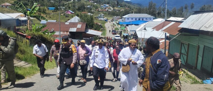 TIFFANEWS.CO.ID – Penjabat (Pj) Bupati Intan Jaya Apolos Bagau, S.T., didampingi MRP Provinsi Papua Tengah, Kepala Dinas BPBD, Disdukcapil, Pariwisata dan Kebudayaan, Kepala Distrik, Pastor Paroki Gereja Katolik Bilogai, Perwakilan Tokoh Agama Protestan, Kapolres Intan Jaya, TNI bersama masyarakat melakukan jalan kaki dari Pastoran Bilogai, Tigamajigi, Yokatapa, simpang lima kantor bupati dan kembali ke pastoran.
