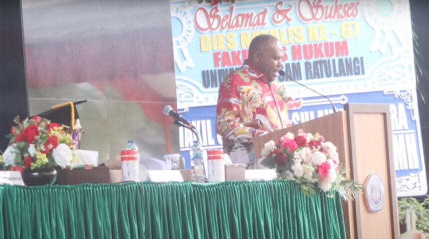 TIFFANEWS.CO.ID,-  Bupati Intan Jaya, Aner Maisini, S.Kom., S.H., M.H., yang juga alumni Fakultas Hukum Universitas Sam Ratulangi (UNSRAT), mendapat kehormatan menyampaikan orasi ilmiah pada Dies Natalis ke-67 Fakultas Hukum UNSRAT Manado, Selasa (26/8/2025).