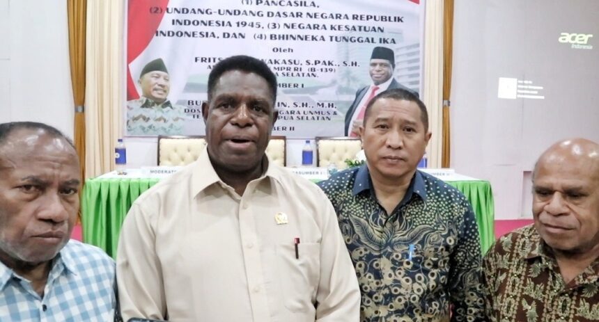 TIFFANEWS.CO.ID – Anggota DPD RI Daerah Pemilihan Papua Selatan, Frits Tobo Wakasu, S.PAK, SH, mengajak seluruh generasi muda untuk terus menanamkan nilai-nilai kebangsaan dalam kehidupan sehari-hari. Hal tersebut disampaikannya saat Sosialisasi Empat Pilar Kebangsaan yang digelar di Aula Rumah Bina Pankat, Kelapa Lima, Merauke pada Senin (30/6/2025).