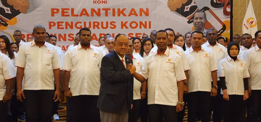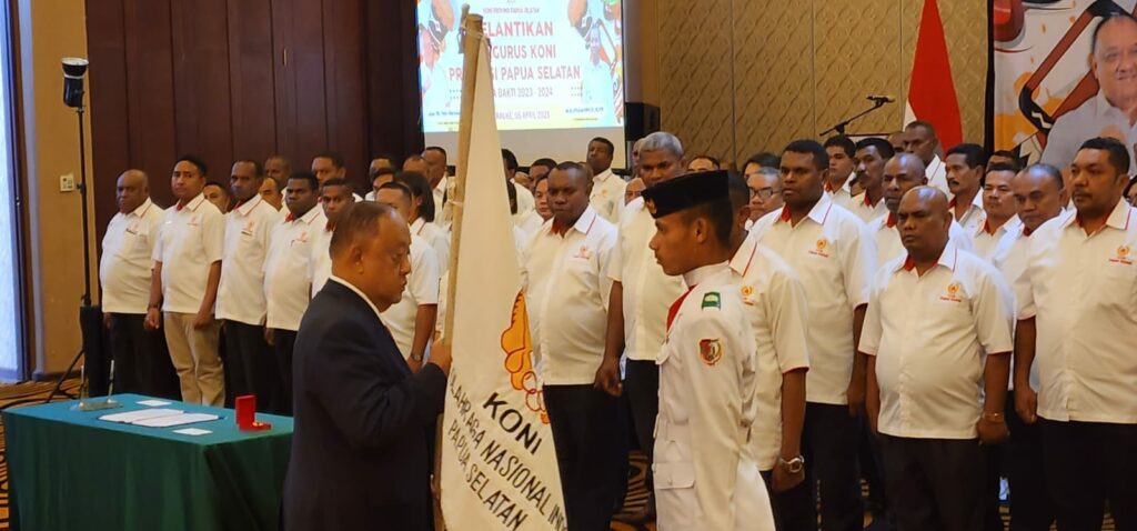 TIFFANEWS.CO.ID,- Ketua Umum KONI Pusat Letjen (Purn) Marciano Norman melantik  120 pengurus Komite Olahraga Nasional Indonesia (KONI) Provinsi Papua Selatan (PPS)  masa bakti 2023 – 2024, di Merauke, Provinsi Papua Selatan, Rabu (5/4).