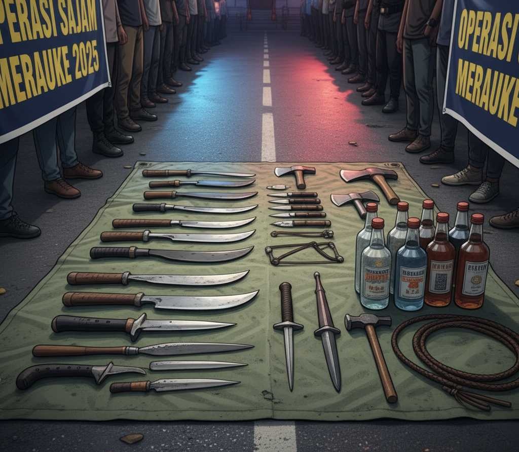 Razia dimulai pukul 19.30 WIT di depan Kantor Pos Merauke, Jalan Brawijaya, dan dilanjutkan patroli di sejumlah titik rawan. Hingga pukul 22.30 WIT, polisi berhasil mengamankan berbagai senjata tajam dan benda berbahaya seperti: