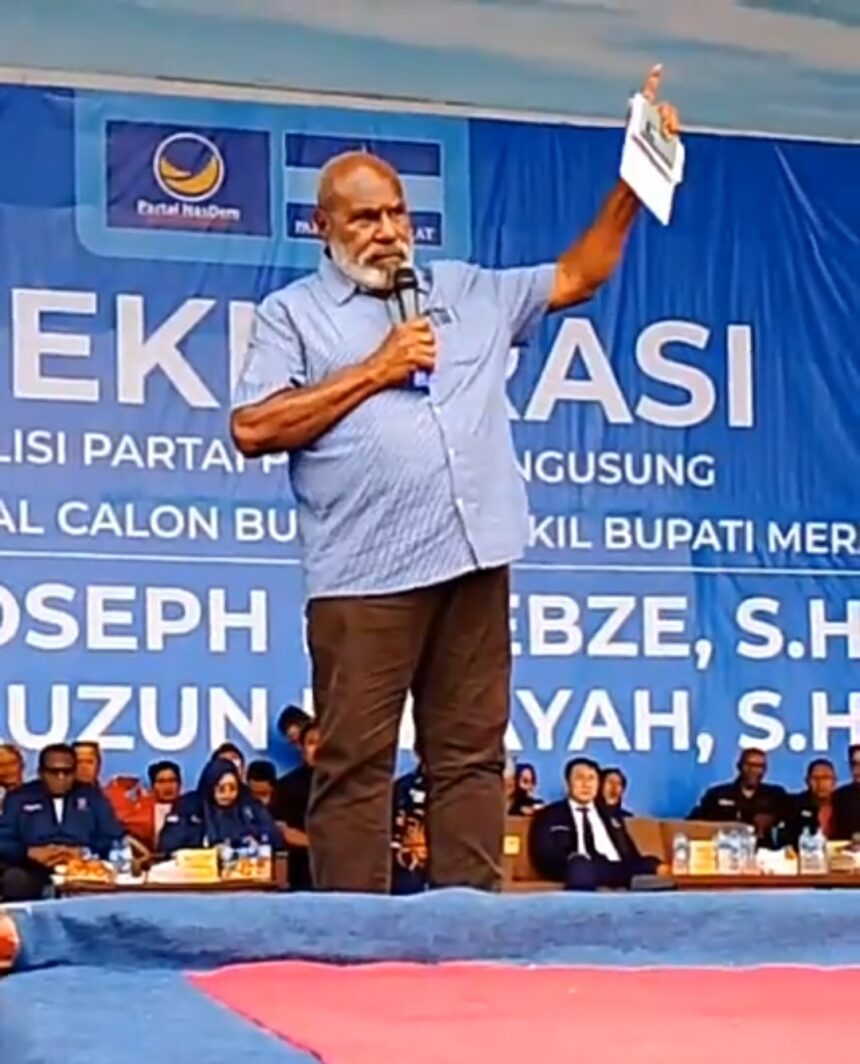 TIFFANEWS.CO.ID – Johanes Gluba Gebze (JGG), tokoh masyarakat Kabupaten Merauke, mengkritik keras Bupati Merauke yang saat ini dijabat Romanus Mbaraka dan DPRD Kabupaten Merauke sebagai pengkhianat rakyat. Kritik ini disampaikannya dalam acara deklarasi pasangan calon Bupati dan Wakil Bupati, Yoseph Gebze dan Fauzun Nihayah (Yosfan) pada Kamis(22/8/2024) di Taman Mandala Merauke.