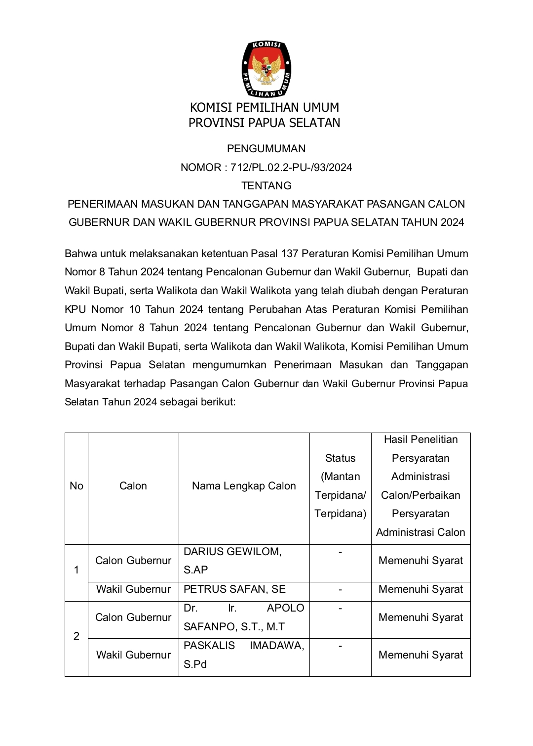 Pengumuman ini dibuat berdasarkan Peraturan KPU Nomor 10 Tahun 2024 tentang Perubahan Atas Peraturan Komisi Pemilihan Umum Nomor 8 Tahun 2024 tentang Pencalonan Gubernur dan Wakil Gubernur, Bupati dan Wakil Bupati, serta Walikota dan Wakil Walikota.