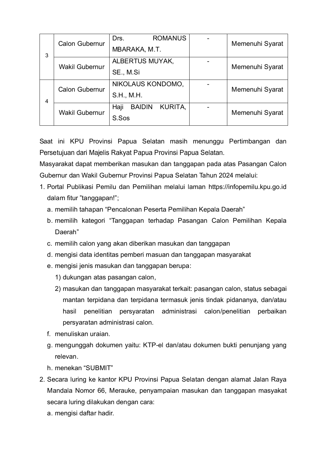 Saat ini, KPU Provinsi Papua Selatan masih menunggu pertimbangan dan persetujuan dari Majelis Rakyat Papua Provinsi Papua Selatan sebelum proses ini dilanjutkan. Untuk menyampaikan masukan, masyarakat dapat menggunakan dua metode: secara daring dan luring.