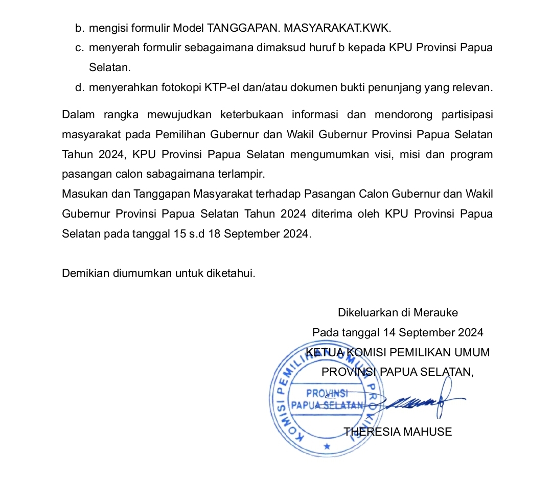 Pengumuman ini dikeluarkan di Merauke pada 14 September 2024 oleh Ketua Komisi Pemilihan Umum Provinsi Papua Selatan, Theresia Mahuse.