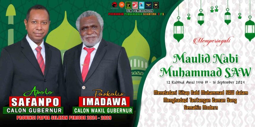 TIFFANEWS.CO.ID – Bakal Calon Gubernur dan Wakil Gubernur Provinsi Papua Selatan, Apolo Safanpo dan Paskalis Imadawa, mengucapkan selamat memperingati Maulid Nabi Muhammad SAW, Senin (16/9/2024) di Papua Selatan.