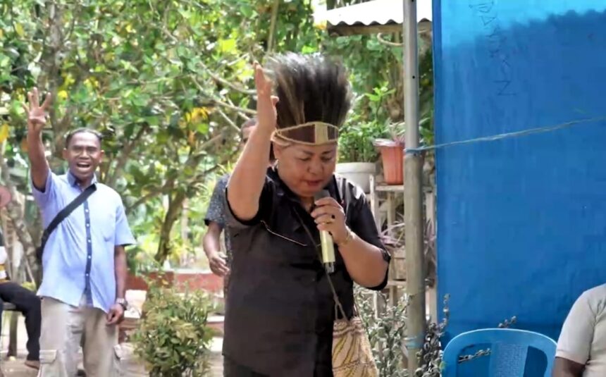 Norma Parapaga, Ketua Tim Pemenangan Perjuangan Pembangunan Sejahtera (PPS) Kabupaten Merauke, menyanyikan lagu "Jangan Sampai 3 Kali" yang dipopulerkan oleh Tagor Pangaribuan dalam acara kampanye di Distrik Sota. (Foto: tiffanews.co.id/istimewa)