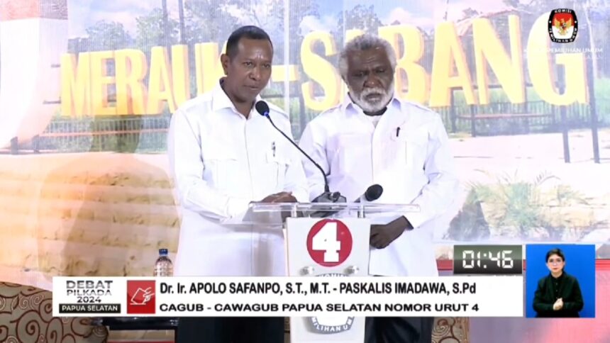 TIFFANEWS.CO.ID – Pasangan calon gubernur dan wakil gubernur Provinsi Papua Selatan, Apolo Safanpo dan Paskalis Imadawa, mengusung visi untuk menjadikan Papua Selatan sebagai provinsi yang bermartabat, aman, damai, dan sejahtera.