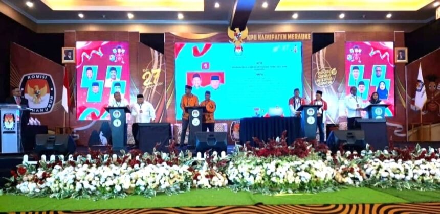 TIFFANEWS.CO.ID – Komisi Pemilihan Umum (KPU) Merauke menggelar debat terakhir untuk Pemilihan Bupati dan Wakil Bupati Merauke, Papua Selatan, pada Rabu (20/11/2024). Debat ini menjadi ajang terakhir bagi keempat pasangan calon (paslon) untuk memaparkan visi, misi, dan program kerja mereka, serta beradu ide dan gagasan untuk pembangunan Kabupaten Merauke selama lima tahun ke depan. Tema debat kali ini adalah “Memperkokoh Negara Kesatuan Republik Indonesia (NKRI) dan Kebangsaan serta Reformasi Birokrasi.”