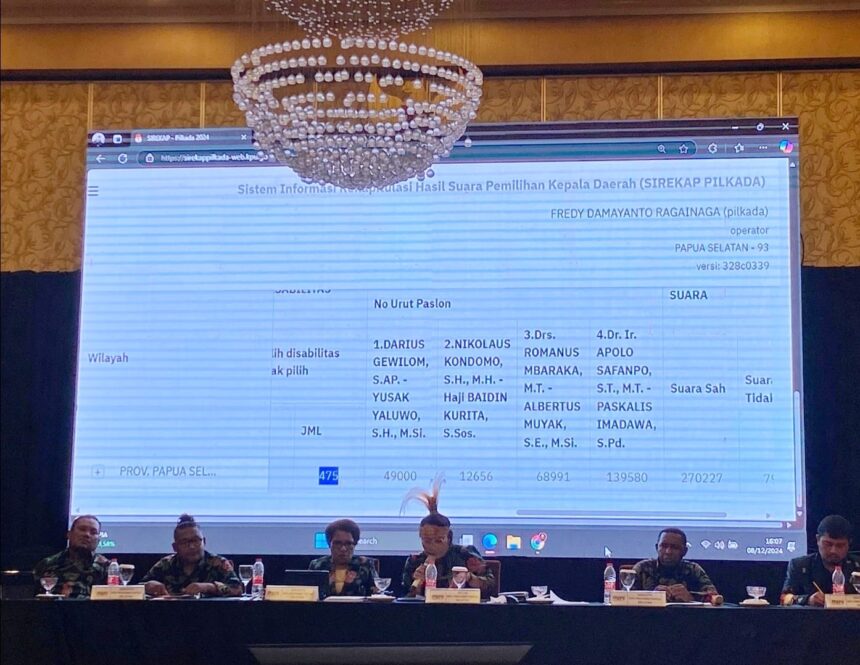 TIFFANEWS.CO.ID – Komisi Pemilihan Umum (KPU) Provinsi Papua Selatan telah menyelesaikan Rapat Pleno Terbuka Rekapitulasi Hasil Penghitungan Perolehan Suara dan Penetapan Hasil Pemilihan Gubernur dan Wakil Gubernur Papua Selatan 2024 pada Minggu (8/12/2024) di Merauke.