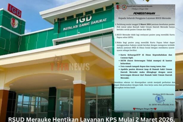 TIFFANEWS.CO.ID – Rumah Sakit Umum Daerah (RSUD) Merauke resmi menghentikan pelayanan bagi pasien pengguna Kartu Papua Sehat (KPS). Kebijakan tersebut mulai berlaku pada 2 Maret 2026 sebagaimana tertuang dalam surat pemberitahuan yang ditujukan kepada seluruh pengguna layanan rumah sakit. Edaran tersebut dikutip dari akun Instagram resmi rsud.merauke pada Sabtu (28/2/2026). Dalam pengumuman itu ditegaskan bahwa layanan jaminan kesehatan di Poli…