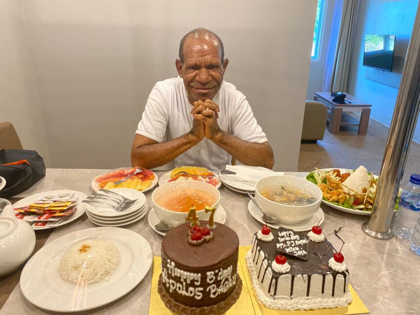 “Selamat ulang tahu bapakku, selamat bertambah umur panjang, happy birday to you,”ucap Apolos meniru ucapan selamat dari Eci anaknya.