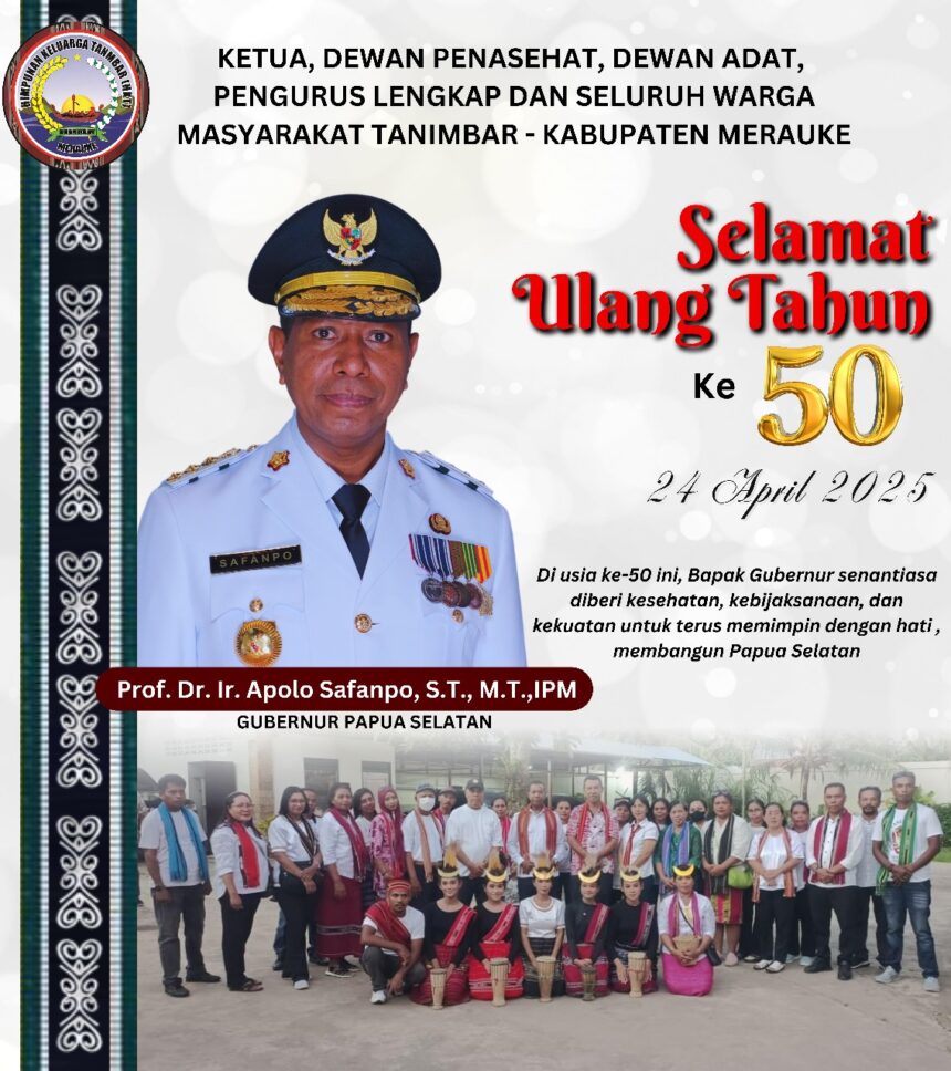 TIFFANEWS.CO.ID — Ketua, Dewan Penasehat, Dewan Adat, seluruh jajaran pengurus Himpunan Keluarga Tanimbar (HKT) dan segenap warga masyarakat Tanimbar di Kabupaten Merauke turut menyampaikan ucapan selamat ulang tahun kepada Bapak Gubernur Papua Selatan yang genap berusia 50 tahun pada hari ini, 24 April 2025.