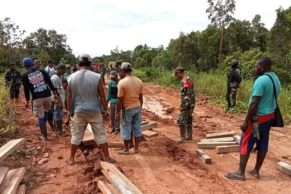 Personel TNI-Polri Bersama Masyarakat Jagebob Perbaiki Jalan Rusak