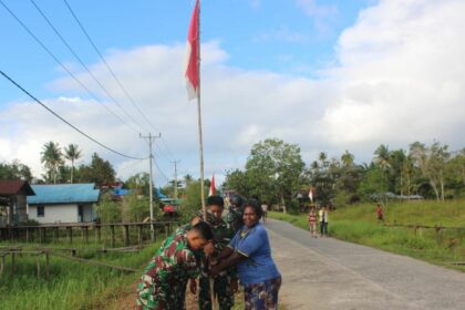 Sambut HUT RI Ke-78, Satgas Yonif 125/SMB Bersama Polsek Citak Mitak Ajak Warga Kibarkan Bendera Merah Putih
